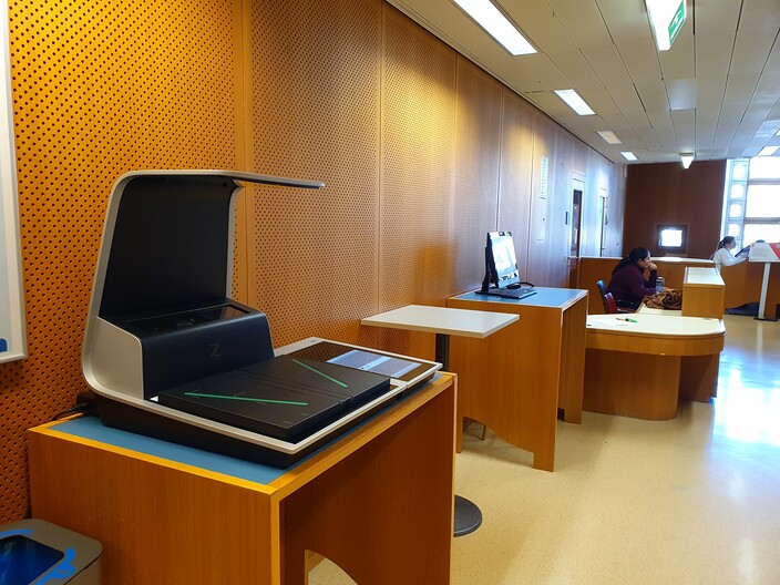 Im Rahmen der Unverbindliche Übung »Einführung wissenschaftliches Arbeiten« besuchte eine Auswahl der Klasse 7a gemeinsam mit Prof. Rundel die Bibliothek der Technischen Universität Wien. Am Treffpunkt bei den Entlehn- und Rückgabeschaltern wartete bereits Matthias Samonig, unser Referent für diesen Vormittag, auf uns. Zunächst wurde uns der Freihandbereich im Erdgeschoss gezeigt und die Systematik, nach der Bücher zu finden sind, erklärt. Auch das Beantragen eines Bibliotheksausweises für Schülerinnen und Schüler wurde uns gezeigt. In den drei Untergeschoßen konnten wir Einblick in das Magazin der Bibliothek gewinnen, und so manches historisches Werk wurde in den Regalen entdeckt. Weiter ging es im 1. Stock, wo wir Buchscanner und Recherchestationen ausprobieren konnten.